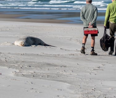 Identification tags are used worldwide to help researchers easily track individuals and make more accurate population estimates. Tags enable identification from a distance so that disturbance can be minimised. Pakake/ New Zealand sea lion pups are tagged by researchers throughout their range.